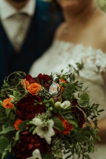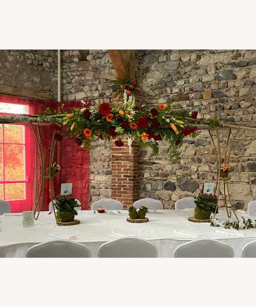Le thème de notre mariage était : champêtre dans les couleurs rouge et orange.