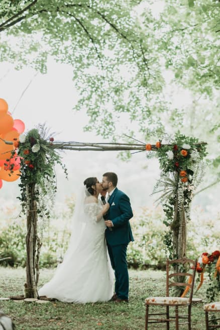 Nous avons créée pour ce couple un mariage à l’ambiance champêtre, style « rando et nature », avec un trio de couleurs : orange, rouge et blanc.